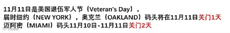 美国时间11月11日是美国退伍军人节,按照往年惯例不少人会好奇:作为全球供应链关键节点的美国港口今年会停摆吗?甚至有网传消息称节日当天纽约、奥克兰码头关门1天,迈阿密码头关门两天?!这是真的吗?