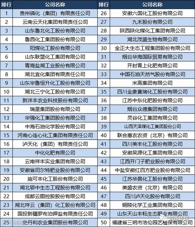 新洋丰农业科技股份排名第十一,深交所上市(000902),依托母公司5亿吨磷矿资源,已形成年产约900万吨高浓度磷复肥的生产能力,为中国磷复肥龙头企业之一[k]。