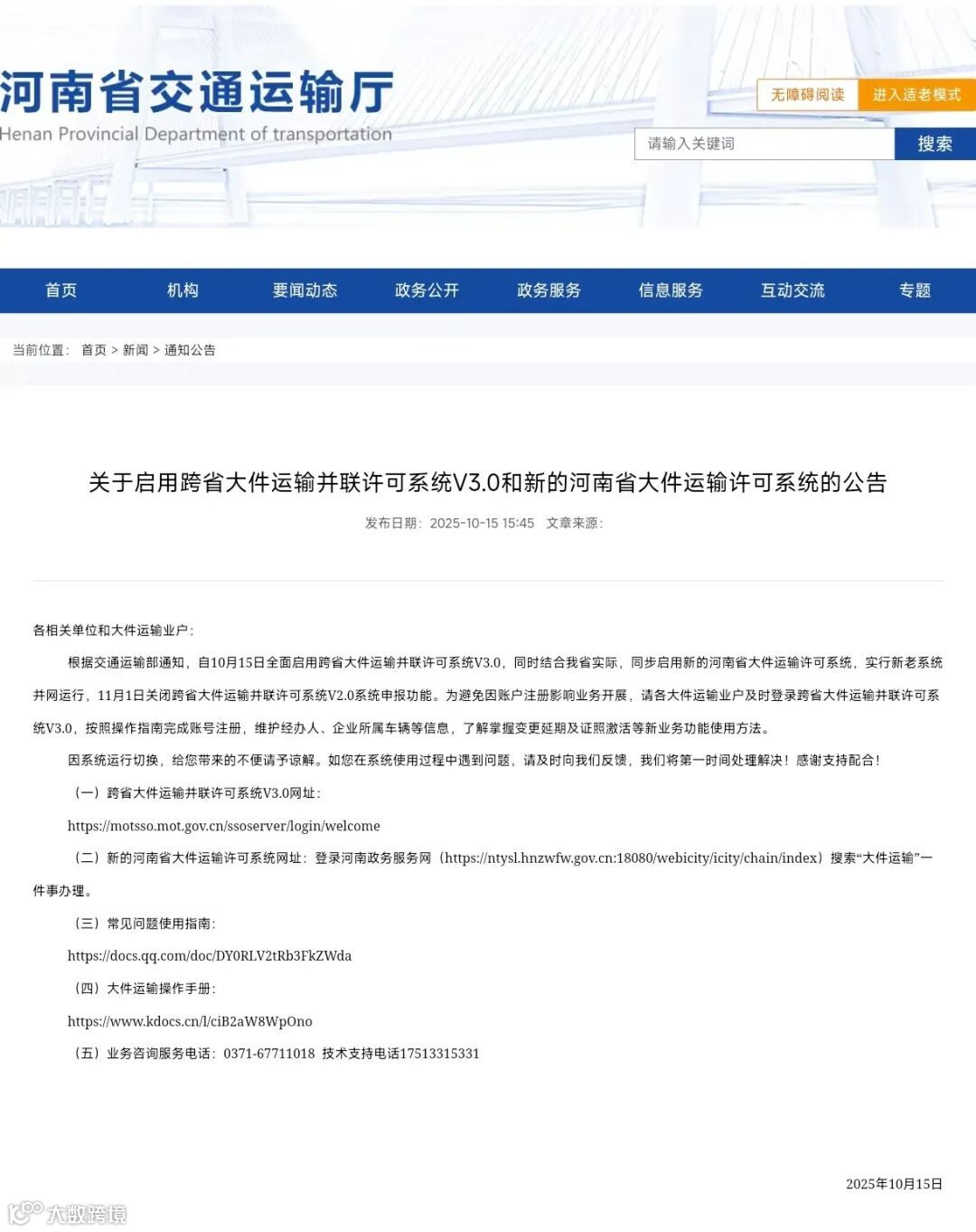 根据交通运输部通知,自10月15日全面启用跨省大件运输并联许可系统V3.0,同时结合我省实际,同步启用新的河南省大件运输许可系统,实行新老系统并网运行,11月1日关闭跨省大件运输并联许可系统V2.0系统申报功能。为避免因账户注册影响业务开展,请各大件运输业户及时登录跨省大件运输并联许可系统V3.0,按照操作指南完成账号注册,维护经办人、企业所属车辆等信息,了解掌握变更延期及证照激活等新业务功能使用方法。