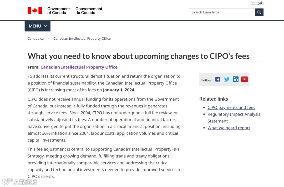 加拿大专利官费将于2024年1月1日上调,上调幅度大概为25%。申请人应付金额以加拿大专利局收到费用的日期为准,而非以缴纳费用的法定期限为准;申请人可在2024年1月1日前依据现行规费的金额缴费,若在前述日期(含)后即应依据新规费的金额缴费。