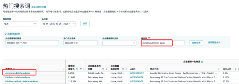 如“christmas kitchen decor”这一关键词,其上周ABA排名为6498名,就曾出现过新品短期占位的情况,这正是机制筛选过程的直观体现。