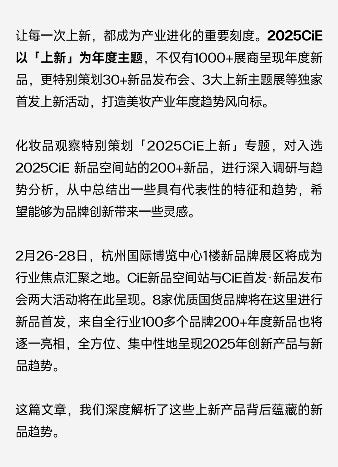 从2025CiE新品空间站的200+新品,可清晰看见2025年美妆行业的三大底层逻辑:功效精准化、体验情感化、价值可持续化。