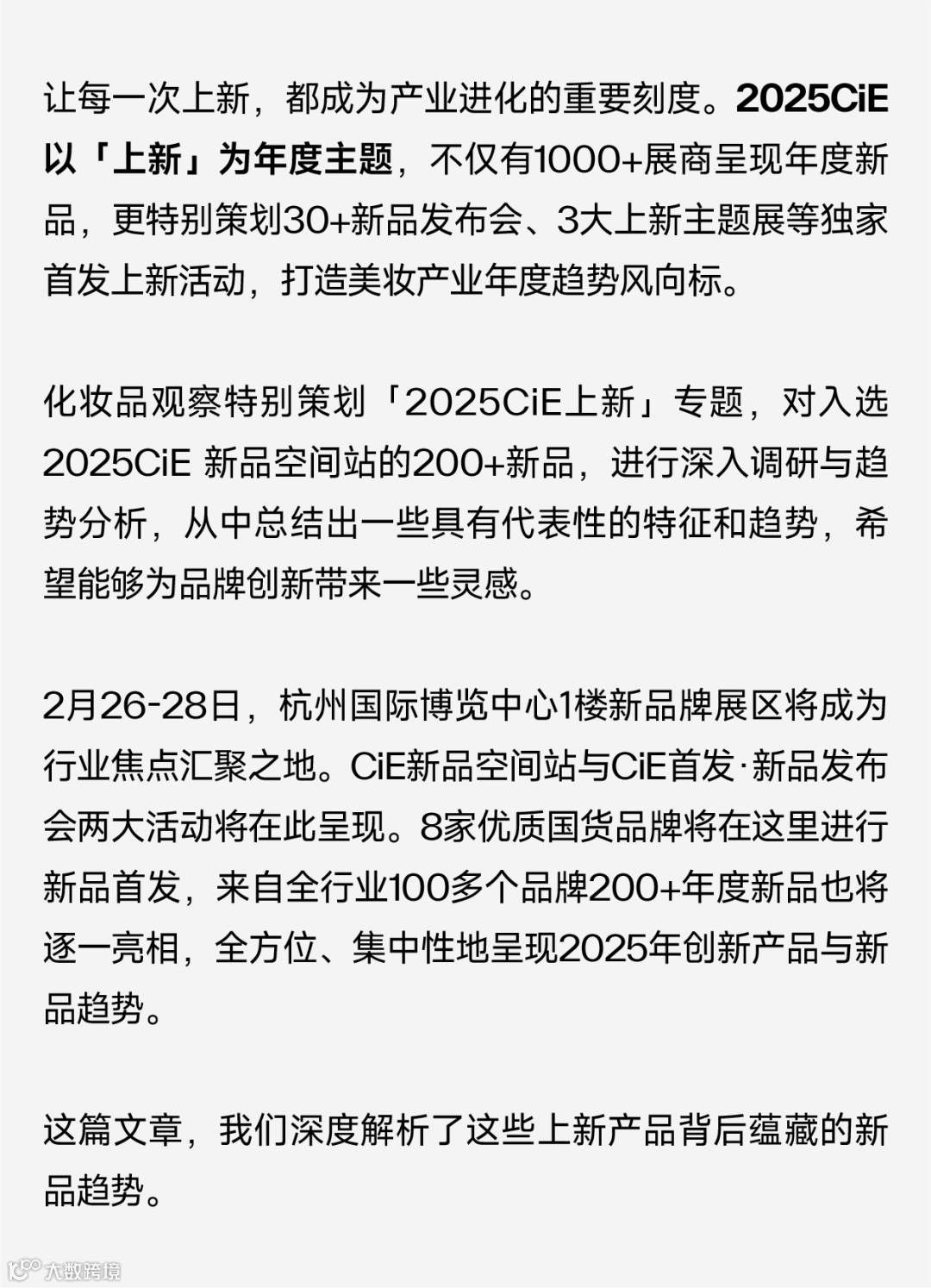 2月26-28日,杭州国际博览中心1楼新品牌展区将成为行业焦点汇聚之地。CiE新品空间站与CiE首发·新品发布会两大活动将在此呈现。8家优质国货品牌将在这里进行新品首发,来自全行业100多个品牌200+年度新品也将逐一亮相,全方位、集中性地呈现2025年创新产品与新品趋势。点击链接报名。