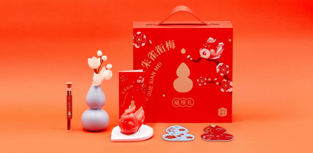 以二十四节气为灵感的节气盒子,最新推出了朱雀衔梅-福䘵礼盒,其以中国传统文化意象——朱雀、梅花、葫芦瓶为主要灵感,并受“疏影横斜水清浅、暗香浮动月黄昏”启发,选天然香为原料,炮制调配“疏影香”和“暗梅香”,最终呈现出承载文化与香气的香氛礼物。