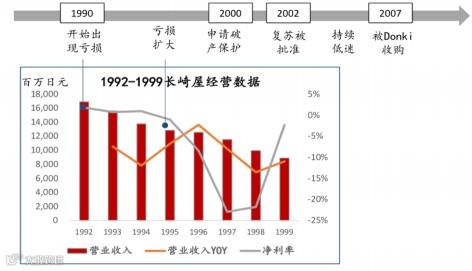 从下图我们可以看到长崎屋在 1990 起开始出现亏损,此后亏损扩大,营业收入和净利率快速下滑濒临破产,2000 年申请破产保护后但持续低迷,直至 2007年被堂吉诃德收购。