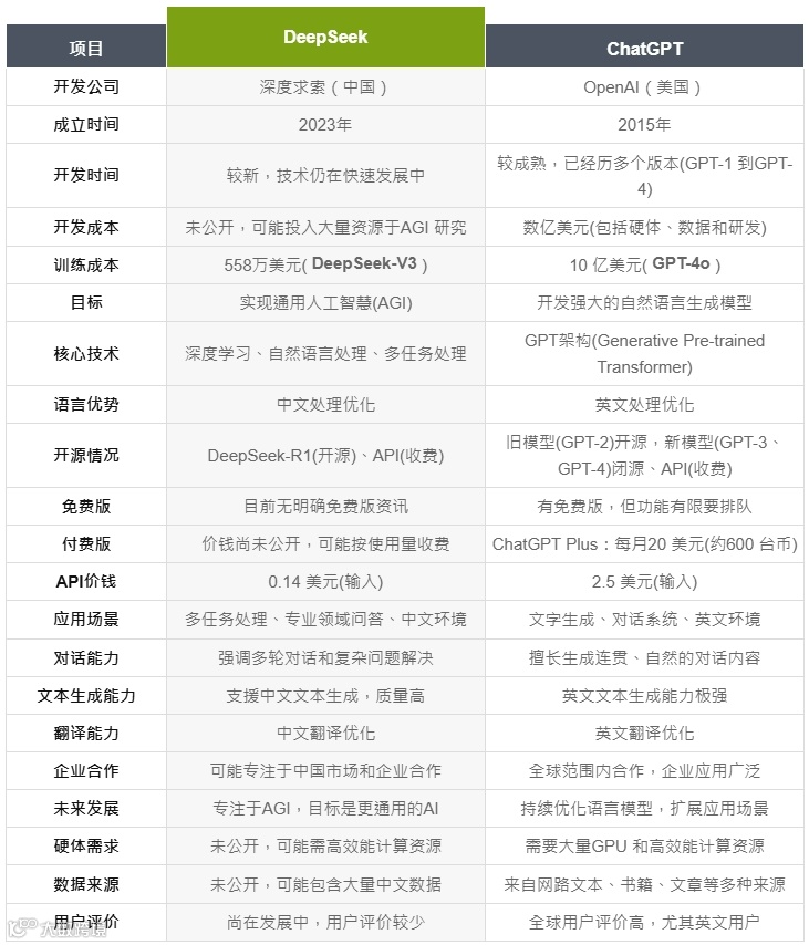 DeepSeek、ChatGPT 比较表 | 来源于Da-vinci | 《DeepSeek是什麼? 對目前的AI有什麼影響?》