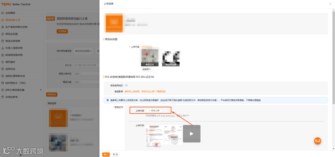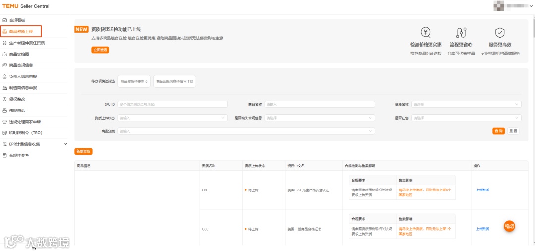 1. 打开“合规中心”页面,进入“商品资质上传”模块: