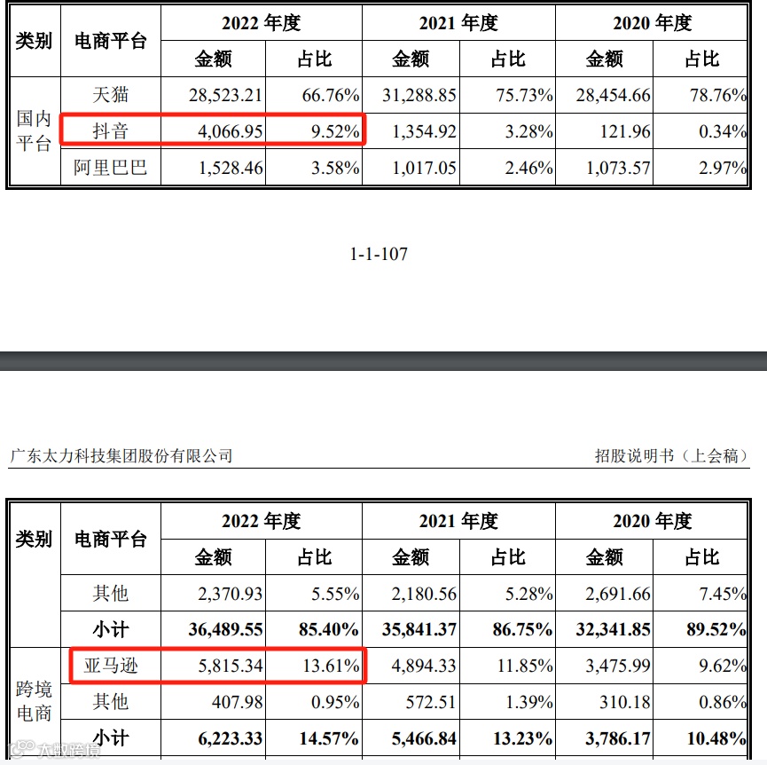 2021年,太力科技在亚马逊上的收入占比从8.44%提升到11.85%。2022年亚马逊的平台收入为5815万元,占比高达13.61%,仅次于国内的天猫