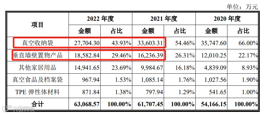 2022年,太力科技全年营收6.38亿元,真空收纳袋贡献了43.93%,由2019年5.18元/个增加到2022年7.21元/个,毛利率达50%以上