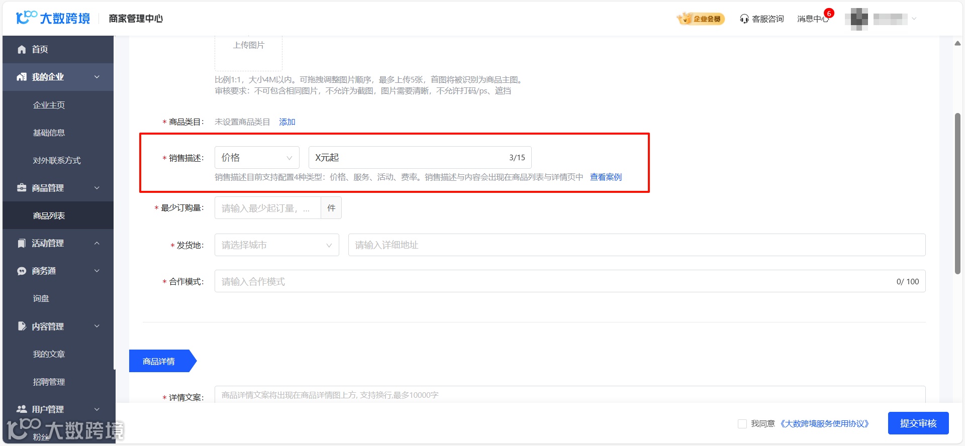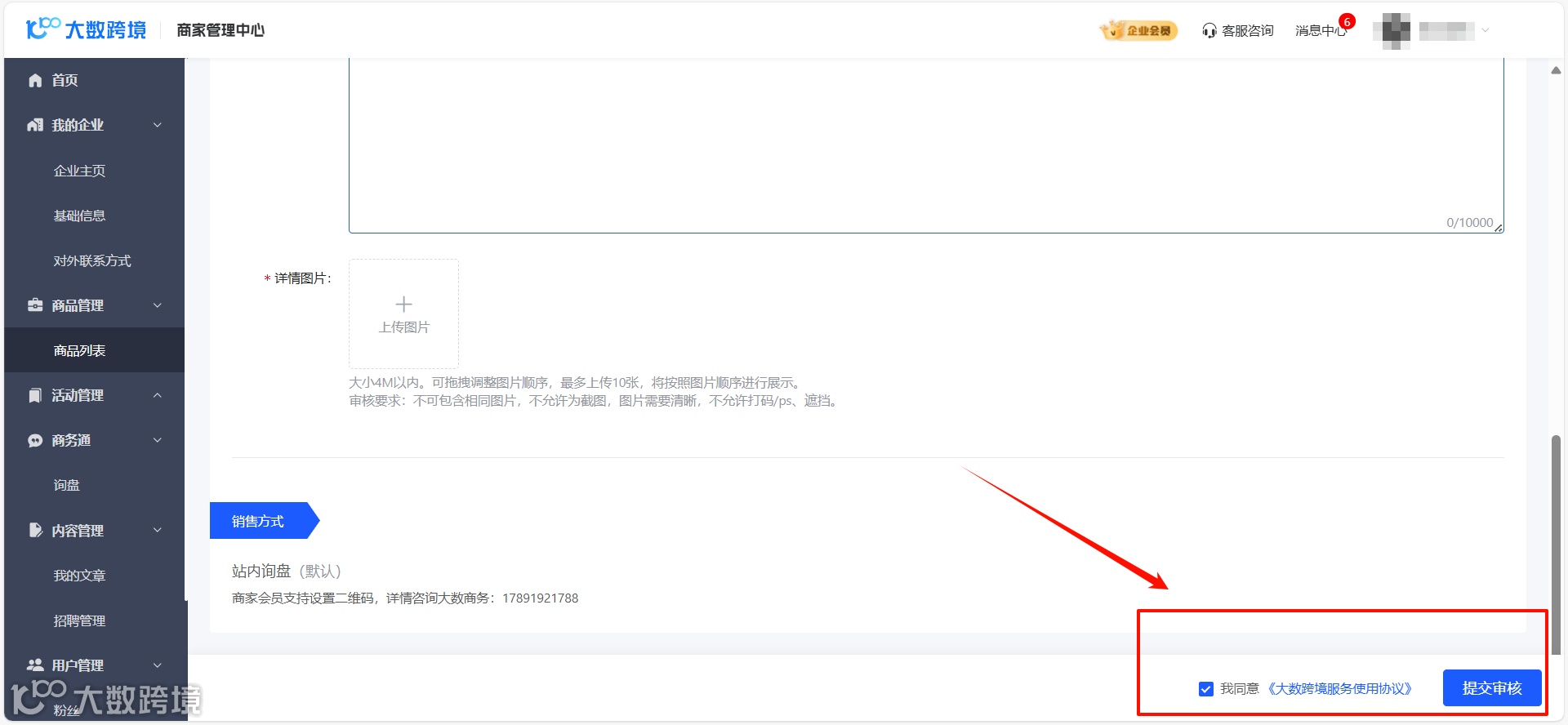 - 所有必填项目填写完毕后,查看协议并勾选同意提交审核,耐心等待审核结果