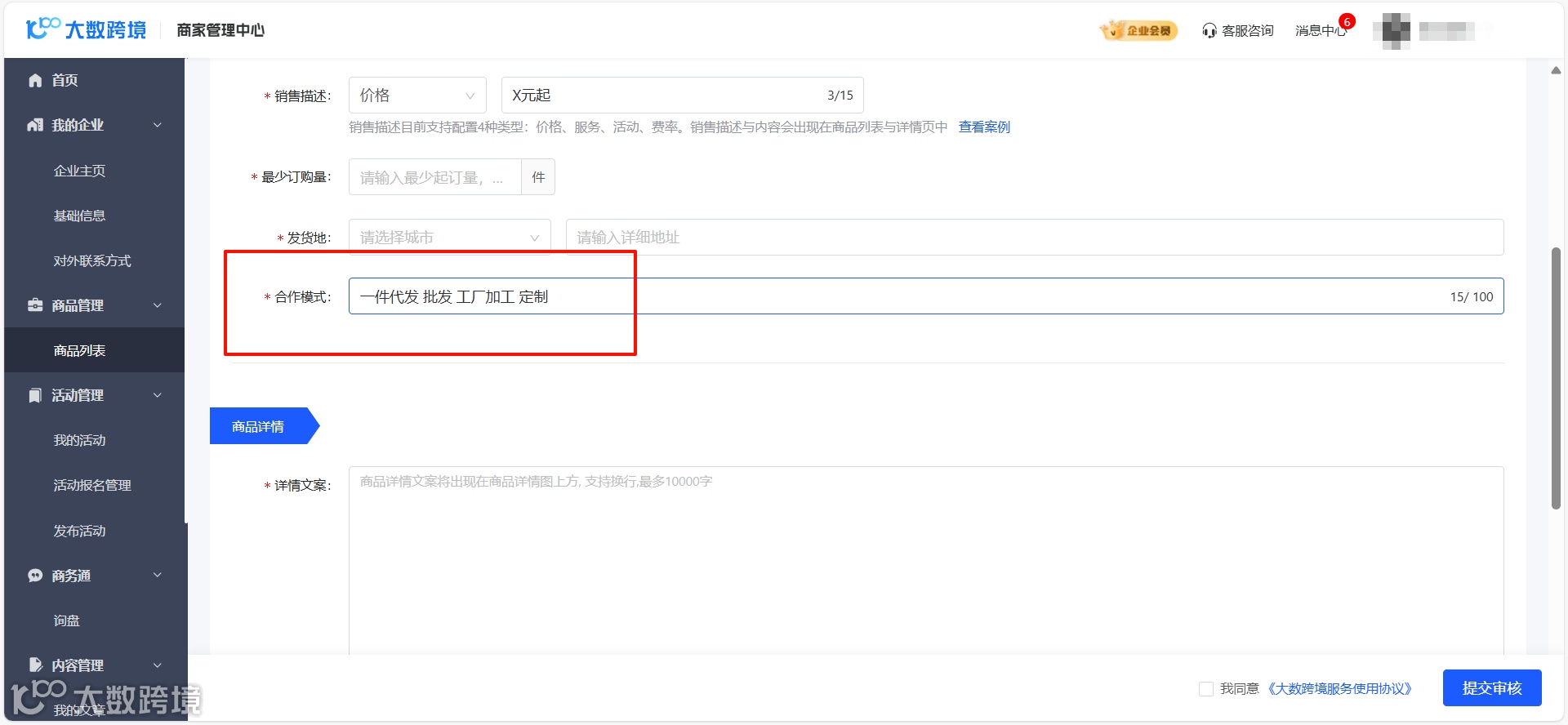 - 合作模式填写参考(一种或多种合作模式,一件代发/批发/工厂加工/定制 等等)