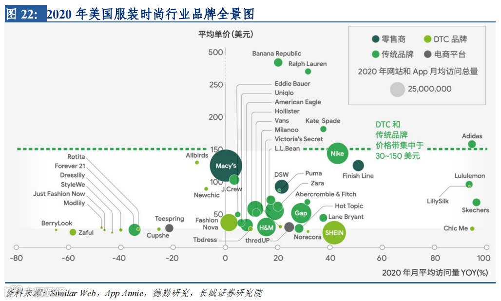 低价高质并深入细分需求,联盟营销打造销量黑马。经营层面,SHEIN 主营快时尚 女装销售。在 2020 年疫情下,线下销售渠道受损严重,海外市场大量消费者选择线上渠 道,从而淡化独立站品牌线下渠道的弱势,赋予成长机会。服饰时尚品牌官网及官方 App 在疫情期间获得显著流量红利,成为跨境电商出海的机会赛道。SHEIN 以极高的访问量 与相对较快的增速表现亮眼,其中 App 端贡献超 70%流量。据 i 黑马,SHEIN 在 54 个国 家 iOS 购物 App 中排名第一,并在 13 个国家安卓设备中排名第一。相比业内其他品牌, SHEIN 具备高性价比、深入细分需求、社交电商营销成熟等优点。