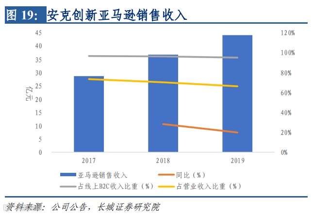 2017-2019 年, 亚马逊贡献收入分别为 28.64 亿元、36.76 亿元和 44.09 亿元,但占线上 B2C 收入比重从 2017 年的 96.44%落至 2019 年的 95.16%,而占营业收入比重从 2017 年的 73.37%落至 2019 年的 66.25%。电商平台入仓方面,公司与京东合作,起步阶段增速高企,但规模仍不及 1 亿元。