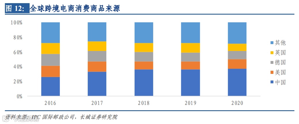 运营端:复制国内电商经验,驶入全球线上消费渗透快车道。我国在生产端持续领 先的稳定性在国货出海品牌化、精品化的趋势下进一步促进海外对我国商品的需求。2020 年全球疫情下,中国卖家保持高敏感度、判断趋势、快速响应。在有效的防疫下,中国 率先复产复工,商家在第一时间为全球消费者在疫情期间提供各类高需求产品。根据 IPC 国际邮政公司统计,中国已成世界最大跨境电商消费商品来源国,2020 年 37%的全球跨 境电商消费品来源国为中国,在全球跨境线上购物习惯加深的浪潮中具备较强获益确定性。