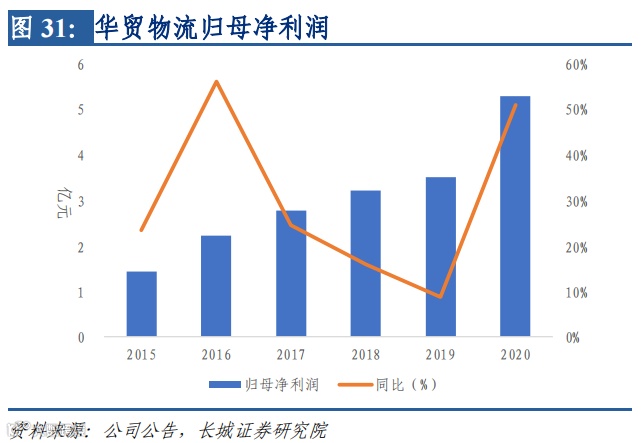 2020年,华贸物流实现营收140.95亿元,同比增长37.47%, 2015-2020 年五年复合增长率为 12.05%。另一方面,华贸物流 2020 年实现归母净利润 5.30 亿元,同比增长高达 51.01%,2015-2020 年五年复合增长率为 29.95%。其中国际空运、 国际海运贡献营收均持续稳定在 35%-40%区间,分别实现 56.96、48.33 亿元营收,同比 分别增长 53.41%、22.19%;而跨境电商物流在 2020 年实现营收同比增长 722.54%至 18.98 亿元,贡献 13.46%营收以及 20.17%毛利。