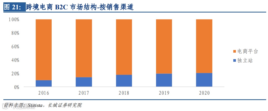 另一方面,出口跨境电商市场按分销对象可分为 B2B 批发与 B2C 零售两种,其 中 B2B 占据主导地位,但在出口跨境电商市场规模中的占比随着 B2C 高增逐步从 2013 年超 85%的水平落至 2019 年不足 80%的水平;而 B2C 因普适性更强,分销渠道可分为 大型多国电商平台、海外本土电商平台、独立站,随着海外需求提升增速较高,在出口 跨境电商市场规模中的占比逐步达到 2020 年的 21.54%。