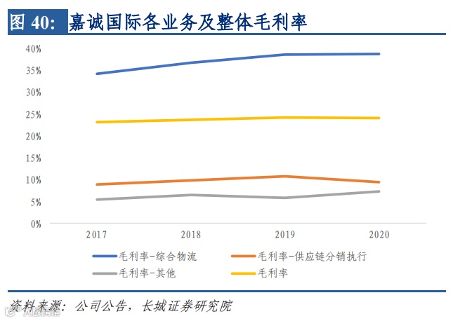 分业务看,公司综 合物流业务虽持续贡献主要营收,但占比随供应链分销业务的高速扩张而逐步下滑,整 体上营收结构逐步趋向综合物流与供应链分销执行各半。从盈利水平上看,各业务盈利 能力分层明显,综合物流业务毛利率保持 35%-40%附近水平,同时持续贡献约 80%毛利 润,支撑公司整体盈利水平;而供应链分销执行业务毛利率进保持在 10%左右,贡献约 20%毛利润。