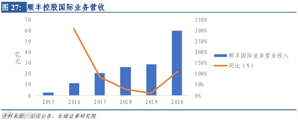 疫情下国际客货运航线萎缩,间接提升货运需求,顺丰控股增开 30 条国际航线,实现货量运输约 9 万吨。同时,散客寄递防疫物资需求的增加贡献 20% 以上的国际业务营收,并使顺丰国际快递服务知名度提升;与美国电商平台合作加深使得 货源基础稳定性、国际包裹处理能力、抗风险能力得到提高。
