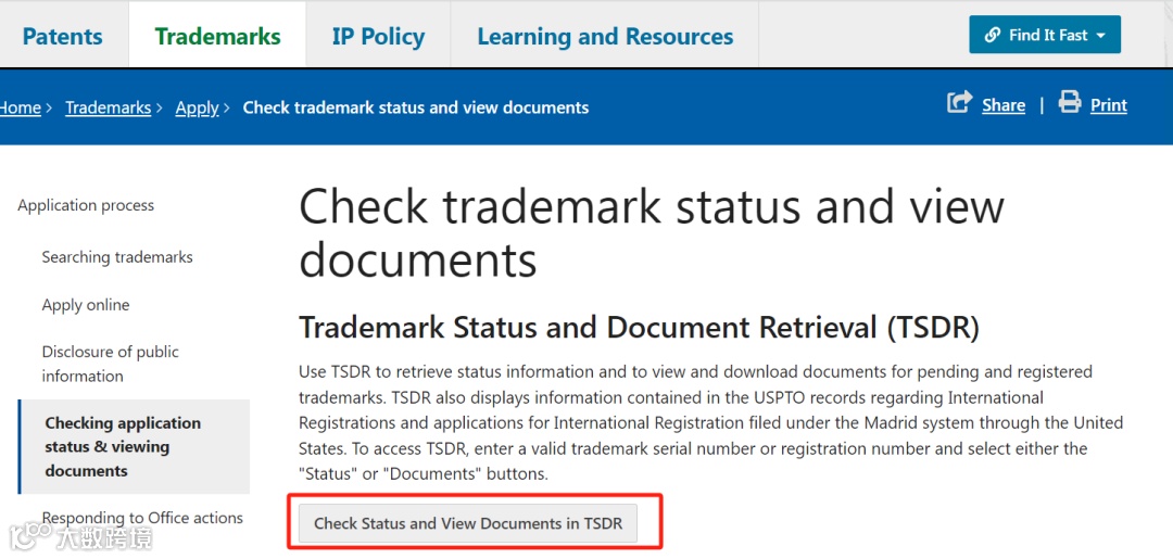 (1)需要登陆美国商标专利局的网址:https://www.uspto.gov/,然后点击「Trademarks」栏目下的「Checking application status&viewing ducuments」