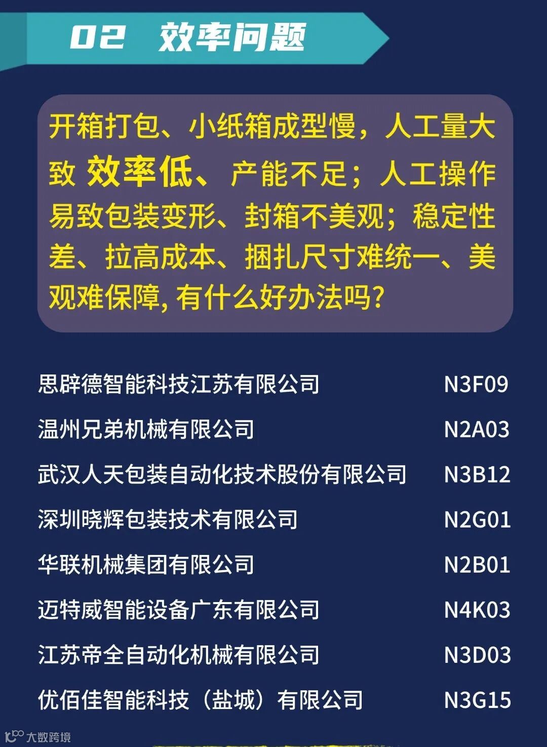 导读:​上海免费参观。为物流运输、快消、3C家电新能源行业,特设快递电商和物流包装专题,包括打包带封箱带、缠绕膜、拉伸/收缩膜;充气柱/袋、气泡膜、葫芦膜、气泡连卷袋;牛皮纸、蜂窝纸、蜂窝纸板箱、瓦楞纸箱、