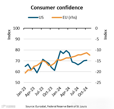 欧盟零售额同比增长但较2019年仍低9.0%,美国零售额虽疲软但仍高于疫情前12.4%[k]