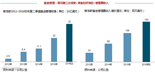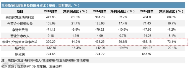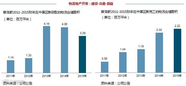 基金管理(fundmanagement),2012财年,普洛斯正式成立基金管理平台,通过引入第三方资本以拓展普洛斯的物流地产版图,结合普洛斯在物流地产运营和开发上的优势,共担风险、共享收益。发展至今,普洛斯基金管理平台已设立9支基金(中国2支、日本3支、巴西3支、美国1支),旗下管理资产规模(AUM)合计达到320亿美元,其中,第三方资本权益占比为73%,充分体现金融杠杆的属性。2015财年,普洛斯基金管理费收入达到1.08亿美元,同比增长59%,2016财年预计将达到1.5亿美元,同比增长50%。