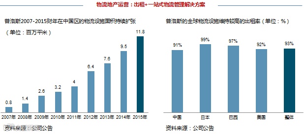 物流地产运营(operation),普洛斯持有、出租、管理物流设施:1)通过出租物流设施获取租金收入,2)也为客户提供一站式的物流管理解决方案,目前普洛斯客户数量超过4000家。2015财年,普洛斯新拓展的出租面积达到370万平米(主要得益于中国客户的强劲需求),平均出租率为93%,稳定在较高的水平,实现租金收入6.24亿美元,同比增长18%。