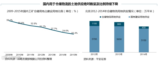 下降原因:1)物流用地价格偏低,对地方政府土地财政收入有限;2)仓储用地经济效益和税收贡献较少;3)仓储业提供就业岗位相对较少;4)物流仓储用地的投资强度较小。因而从供求端来看,目前物流地产市场呈现出供不应求的状态,尤其是在一线城市,供需不匹配的情况就更加严重,以北京为例,其在2012-2014年仓储物流用地的供应占比从19%下降至8.7%。因此,未来物流地产竞争的焦点将逐步转移至二手土地的开发利用上。