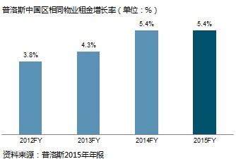 从目前现代化仓储设施的租金角度看,租金收入增长较为稳定。我们统计了普洛斯中国区相同物业租金增长情况,可以看出,从2012财年到2015财年,相同物业的租金年增长基本在4%以上;