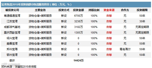 我们整理了宝湾物流2015年的部分物流服务项目投资情况,可以看到,其资金来源全部自筹(见下表)。