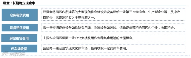 租金收入是物流地产主流的收入方式,租金收入主要包括仓库租赁费用、设备租赁费用、房屋租赁费用以及停车场收费等,其中仓库的租赁费用是租金的主要来源;
