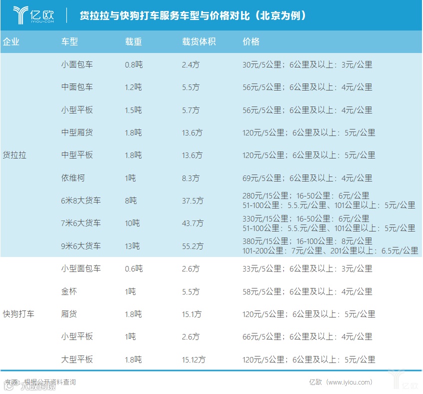 货拉拉与快狗打车服务车型与价格对比