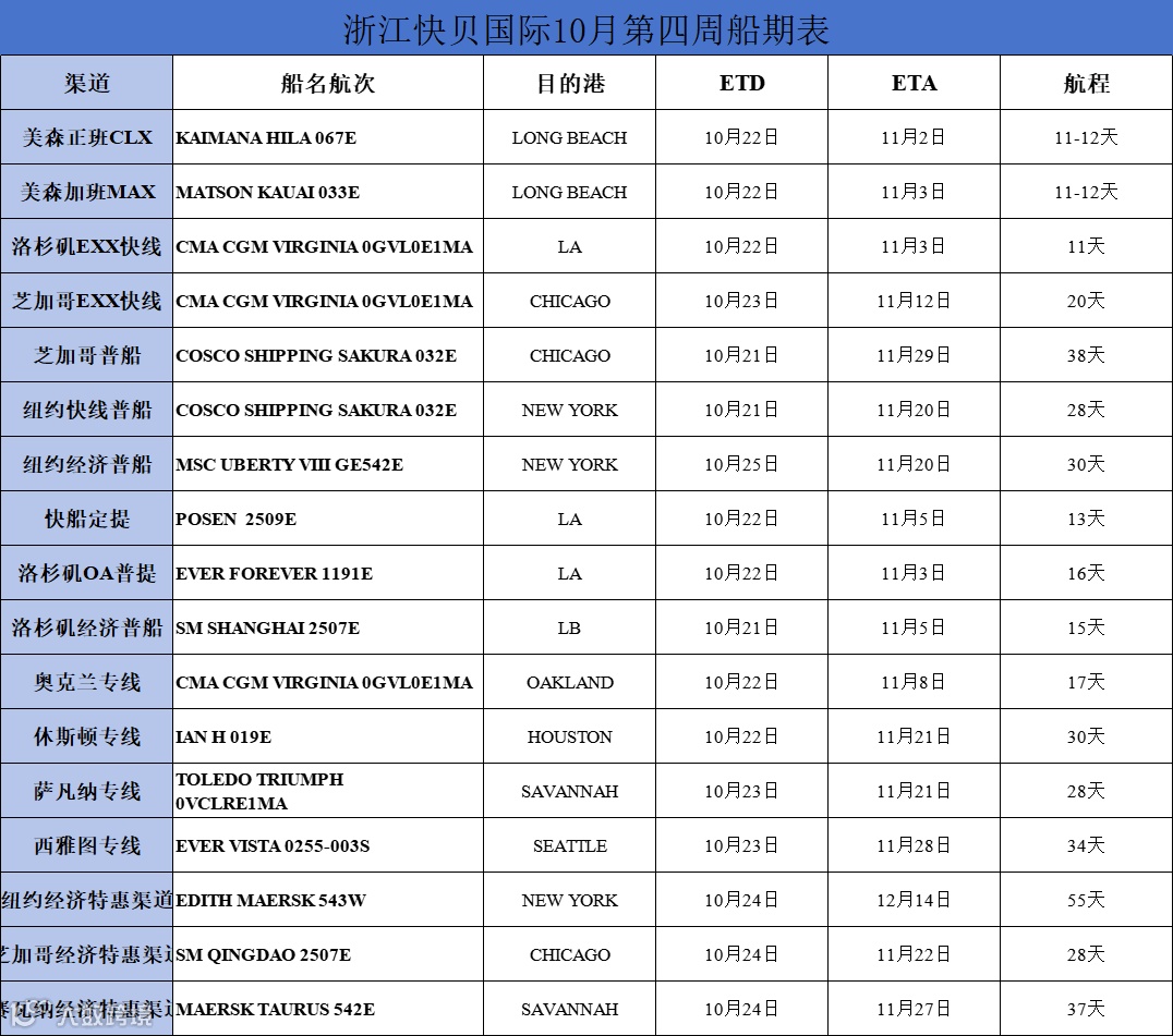 右滑查看浙江快贝10月第4周船期表
