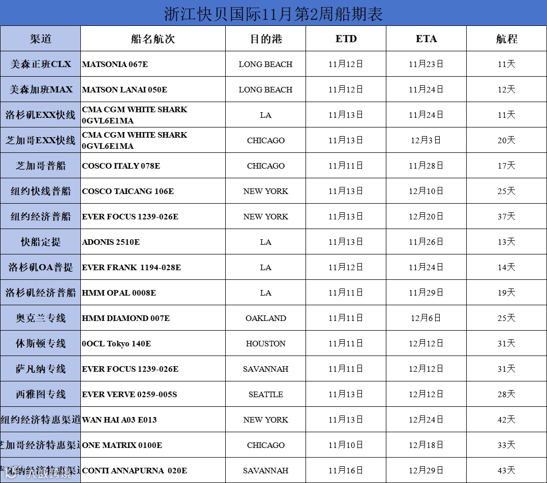 右滑查看浙江快贝11月第2周船期表