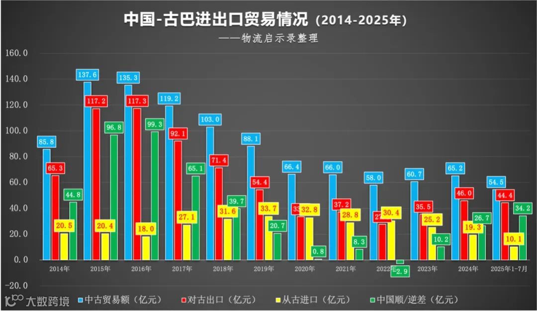 2024年,我国与古巴双边贸易额65.2亿元,其中出口46.6亿元,进口19.3亿元。