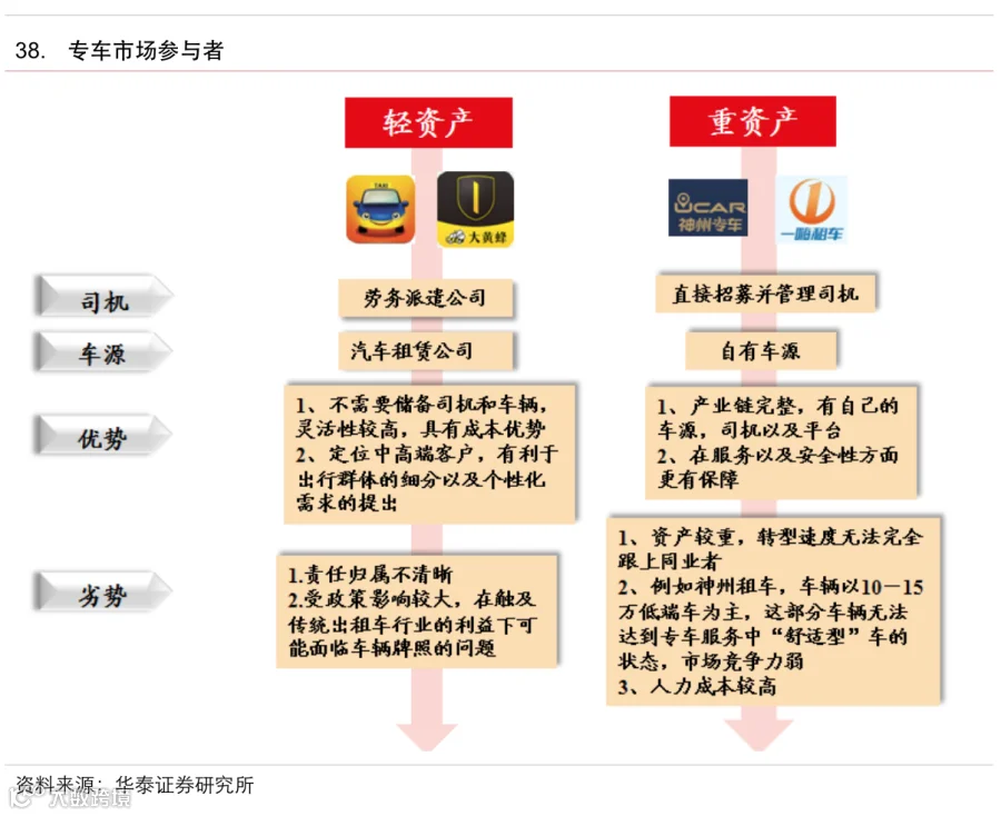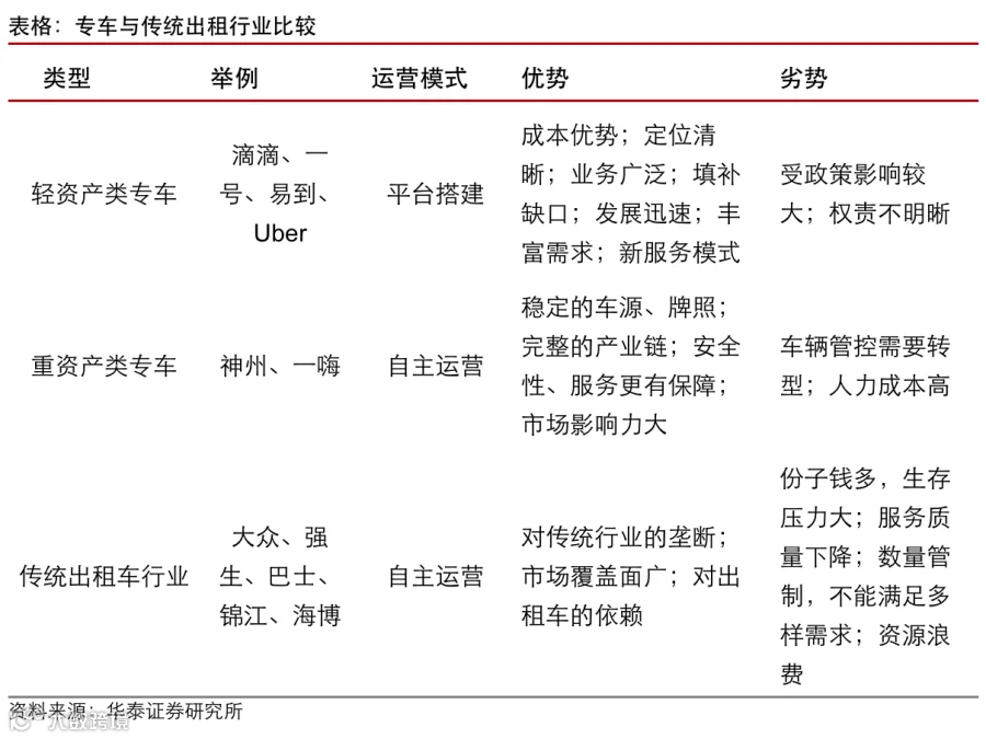 从专车之间比较来看,由于运营模式的不同,滴滴专车,一号专车,易到用车、Uber、百度专车等资本相对更轻,以搭建平台为主,而神州租车、一嗨租车、AA租车除搭建平台外,还拥有自己的车队。