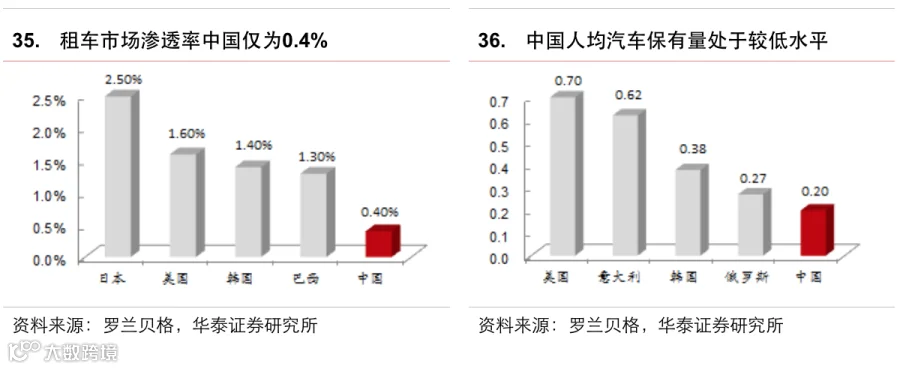 这里可以看到,日本的租车市场渗透率高于美国;主要是因为日本的人口密度高,在大城市的持有车辆成本高;当然人口密度高的城市公共交通发达后对驾车出行依赖也降低。
