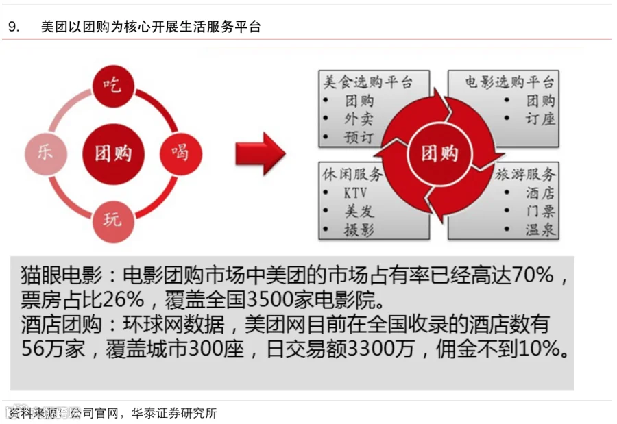 团购事实上是一个很明显的线上线下互相导流的一个市场:商家通过更优惠的价格吸引消费者,而网站也会主动吸引有消费倾向的人员流量。所以美团将自己在团购方面的优势转化为生活服务平台的土壤,可谓走得是直接又恰当。