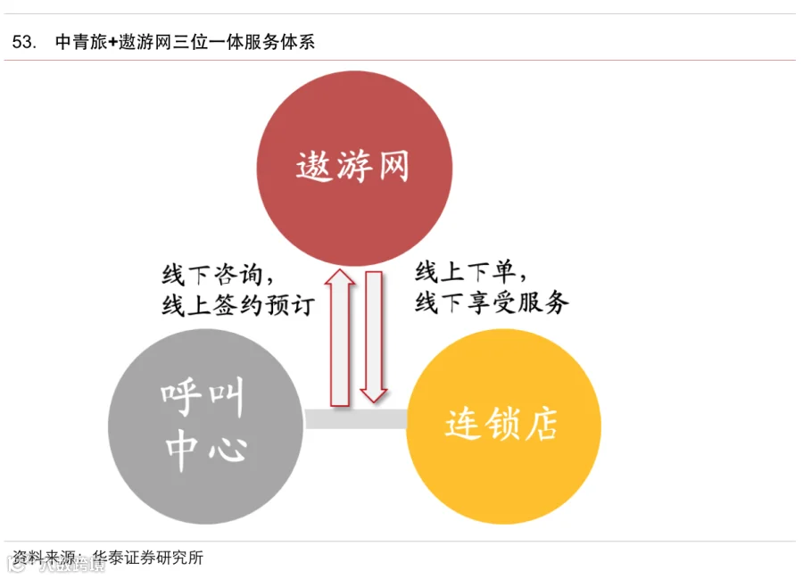 中青旅将遨游网、呼叫中心、连锁店之间打通,从而形成了一个三位一体的服务体系。中青旅控股总裁张立军在“遨游网+”战略分享会上表示:“简单地说,就是传统用户享受了线上渠道的便利,线上用户感受到了线下的服务,互相借势、良性互动。”