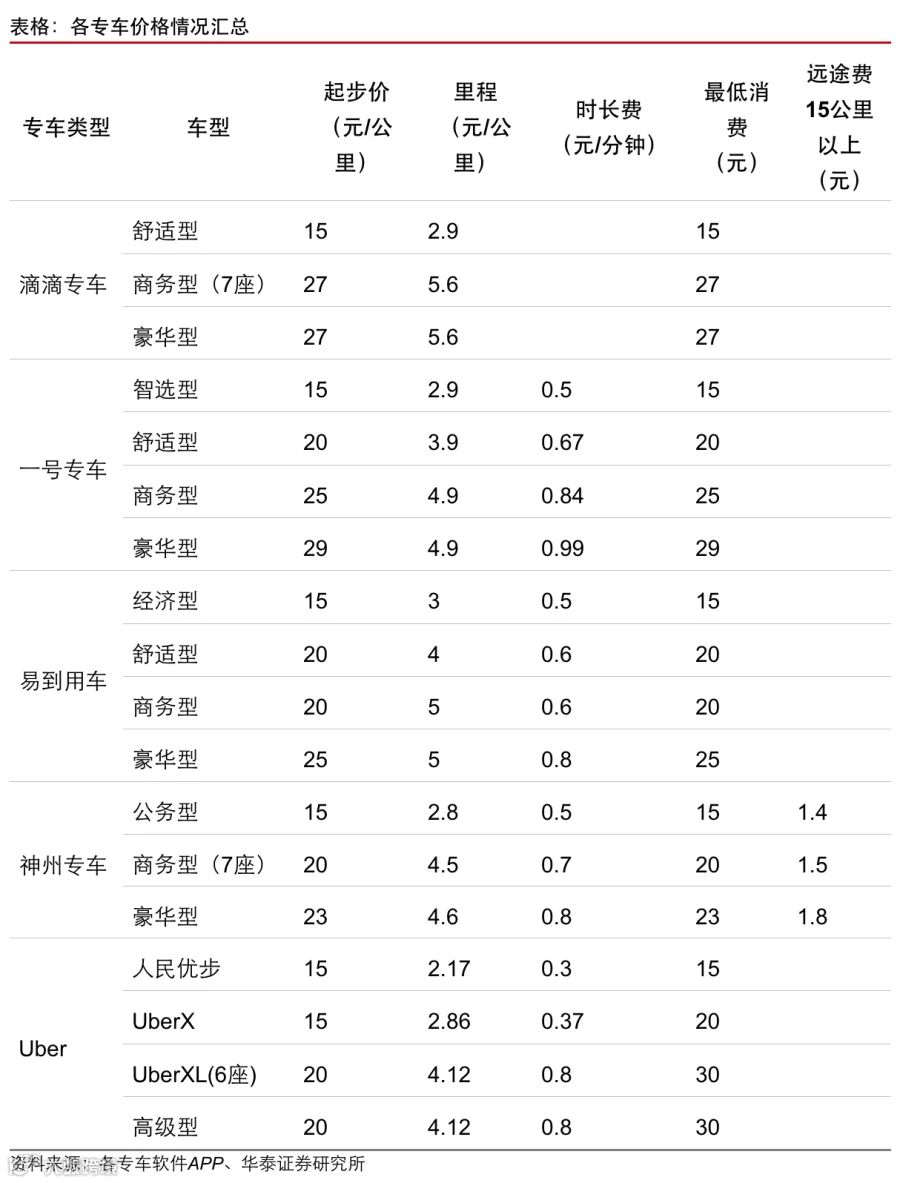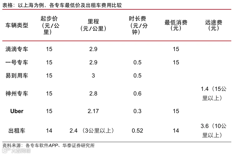 与出租车相比,各个专车的最低价格与出租车价格范围基本一致(以上海价格为例,出租车起步价14元、里程费2.4元/公里,而专车最低档用车的起步价均为15元、里程费2.17-2.9元/公里),而专车的车辆和服务又好于出租车,正是这部分用车流失导致了对出租车需求的强烈冲击。