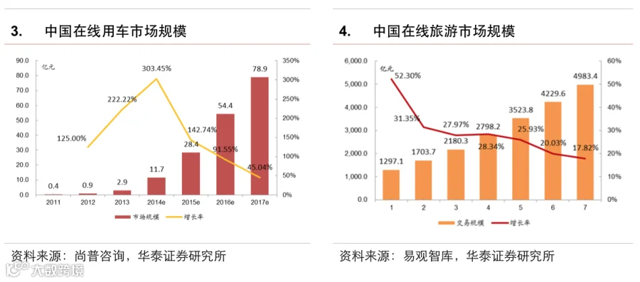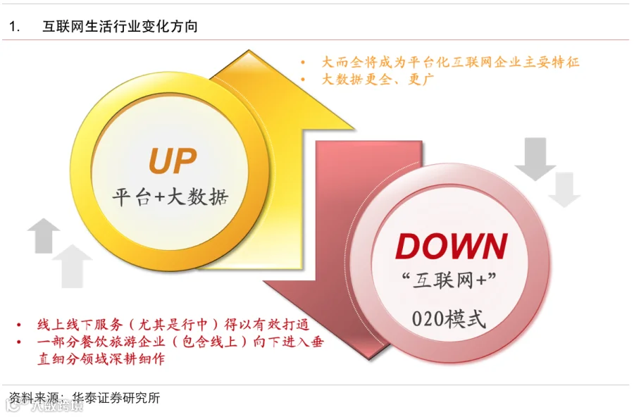 不只是旅游,是全方位的生活服务。中产阶级消费兴起叠加移动互联网加速渗透,旅游行业在供需两端变革的共振效应下表现出巨大的增长弹性。但这只是冰山一隅,移动互联网所改变的,是涵盖吃住行游的全方位生活服务。过去信息化的盲点在移动时代最大程度地被覆盖,线上数据和线下服务的有效对接构建了一个包含人的服务、现金流和信息流的完整生态圈。