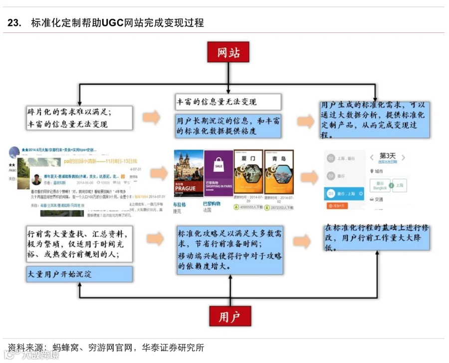 UGC作为距离C端最近的商业模式,其优势在于最大程度反映了用户需求,且信息丰富,但劣势在于信息和需求均碎片化,用户难以利用,商家难以变现。部分UGC旅游网站通过数据的结构化成功将传统游记加工成标准化攻略——如蚂蜂窝攻略、穷游锦囊和行程规划等——成功解决了上述信息碎片化的问题。2014年成立的游谱旅行的模式更进一步地推进了结构化数据的现实应用,其行程定制功能实现了为出境游客定制个性化旅程的需求,首次引入了行程规划师这一概念。用户通过前期基本信息的选择就可以得到一份通过数据库关联的行程规划,让整个过程更加标准化。这也正是攻略/行程规划类网站逐步发展的一个全新体现。