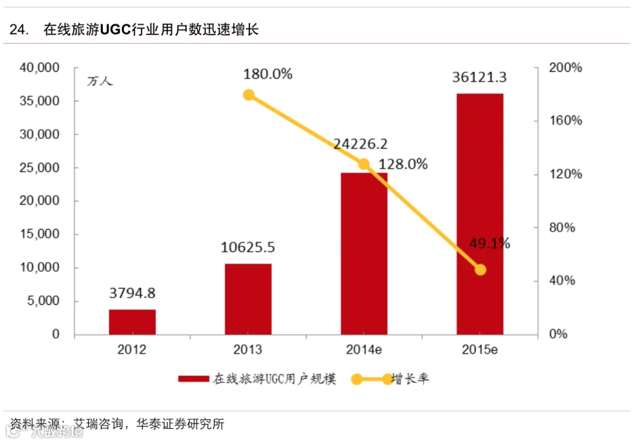 根据艾瑞咨询发布的数据,2014年中国在线旅游UGC行业用户规模达2.4亿人,同比增长128.0%,预计 2015年在线旅游UGC将突破3.6亿人。