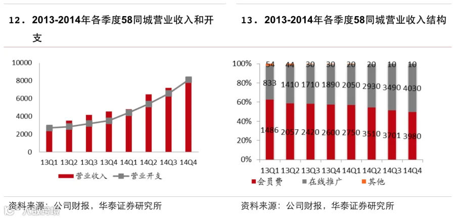 58同城和赶集网这一对老冤家从创建之初就结下了“梁子”,两者均于2005年模仿美国最大的分类广告网站Craigslist的营业模式开创网站。作为世界上最成熟也是最成功的分类信息网站之一,Craigslist在全球50多个国家、450多个城市设有分站,ALEXA全球网站排名62位(以2015年4月9日为准)。Craigslist向绝大多数用户和商家免费提供信息平台,同时网站上不登载任何推广广告,其营业收入主要来自针对少数城市特定类型的广告(例如招聘以及房产中介)收取的费用。基于其庞大的用户流量,2013年Craigslist的营业收入达1.67亿美元,同比增长30%;另一方面,Craigslist全公司只有不到40名员工来维护网站和提供客户服务,信息发布和监控都主要依靠用户的反馈,根据AIM Group的报告,2013年Craigslist的运营费用基本没有增加,净利润率高达80%。
