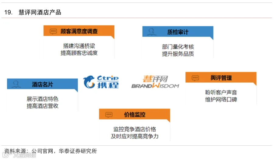 携程自身作为酒店预订OTA已经掌握了酒店大数据中的行前数据:交易和搜索部分。2013年11月,公司以2,200万人民币现金加股权的代价收购了上海益商网络科技有限公司(慧评网)35%的股权。慧评网成立于2012年,其根据中文语义理解技术和网络聚焦爬虫技术对多个酒店进行监控,并收集整合公开的酒店点评信息,从而为酒店提供点评监控和管理系统产品服务。