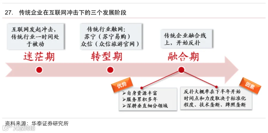 在互联网的冲击下,传统企业将依次经历迷茫期、转型期和融合期。部分优势公司已进入到后两个阶段,但市场仍因其传统企业的标签而大幅低估其价值,存在一定预期差,因而具有较大的投资价值。