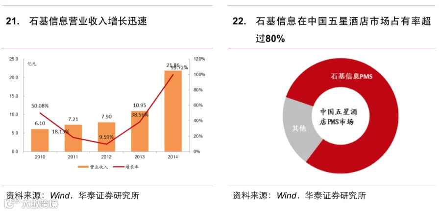 2006年,国内PMS龙头企业西软科技被石基控股。石基控股西软之前已经收购了当时位居前五的北京泰能,目前在中国五星级酒店行业石基在信息管理系统市场占有80%以上的份额,为6000家以上酒店提供服务。石基的酒店信息管理系统已成为业内标杆,被超过100所中国旅游学院作为酒店专业课教材。尽管新推出的PMS系统有倾向于免费的模式,单对于目前的中高端酒店市场来说,石基的垄断地位不会因免费PMS的出现而动摇。反而相对而言,石基信息因为背靠阿里,因而在流量、技术和资本等方面享有一定的竞争优势。