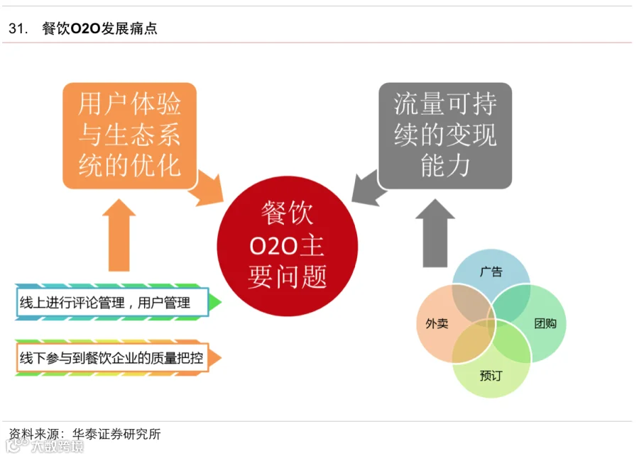 餐饮O2O企业主要面临的难点有两个:第一,用户体验与生态系统的优化,生态系统能一头黏住客户,一头圈住商家;第二,流量可持续的变现能力。
