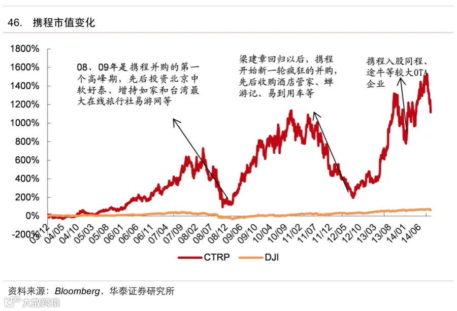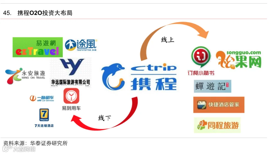 除深耕产业链提升产品壁垒之外,围绕旅游这一主题,携程通过一系列并购,打造了一个强大的在外出游O2O生态圈。在线上,2011年1月,携程投资订餐小秘书,拓展订餐相关业务。2012年2月,携程投资平台松果网,进军中小酒店预定业务。2013年5月,携程投资专注于经济连锁酒店搜索预订业务的“快捷酒店管家”应用;2014年1月,携程确认控股蝉游记,将蝉游记数万篇旅行攻略资源收入旗下,由此携程得以扩大自己的数据库和移动端流量入口。同年,携程连续入股途牛和同程,目标指向途牛的团队游资源和同程的门票业务资源;在线下方面,除了先后收购了永安旅游、华远国旅等旅行社外,2013年年底,携程还先后投资“易到用车”和“一嗨租车”,这实际上是目的地小交通。2014年携程入股途风网,以期分得其在出境游和国际旅游的优质资源。携程很明显正在向线上线下同时开展O2O大方向发展,我们可以对未来的大携程旅游生态圈拭目以待。