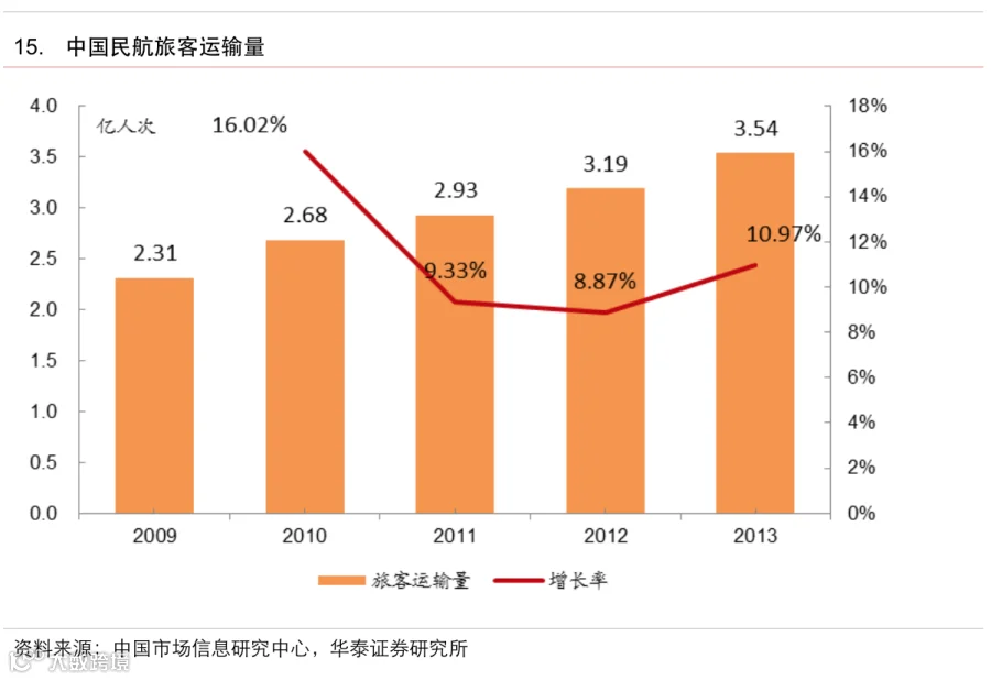 中国民用航空局发布的《2013年民航行业发展统计公报》报告显示,2013年中国民航共完成旅客运输量3.54亿人次,同比增长10.8%。国内航线完成旅客运输量3.27亿人次,同比增长10.6%;国际航线完成旅客运输量2655万人次,同比增长13.7%。